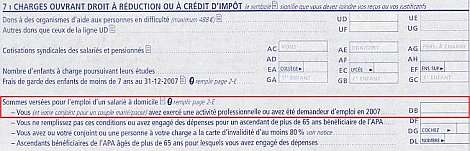 Pour la déclaration d'impôts 2007, remplissez la case DB (section 7) : "sommes versées pour l'emploi d'un salarié à domicile" comme illustrée ci-dessous.